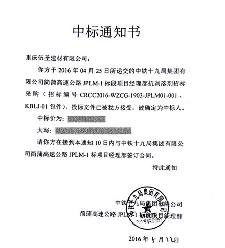 公司(si)成功中標中鐵十九(jiu)局集(ji)團有(you)限公司(si)抗剝落(luo)劑采(cai)購(gou)項目