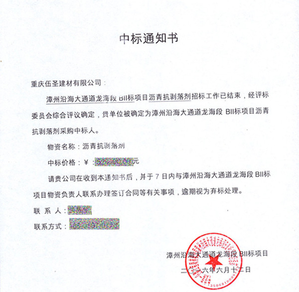 公司成功(gong)中標漳州沿(yan)海(hai)大通道(dao)龍海(hai)段(duan)瀝青抗剝落劑采購項目