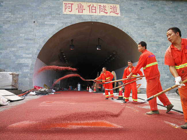 為提高大(da)山包一級公路的安全(quan)性能,我司(si)按照業主要求(qiu)在(zai)各(ge)隧道口及下坡路段鋪(pu)裝薄層環氧抗滑層。接到(dao)任務后我司(si)克難(nan)攻堅(jian)、狠抓工(gong)(gong)程質量和安全(quan),最終保質保量的完成了施工(gong)(gong)任務,得(de)到(dao)業主方的高度肯定,同時也為該路線(xian)在(zai)月底順利通車(che)奠定了基礎。(重慶伍圣建材(cai)有限公司(si) 行政部:傅艷)