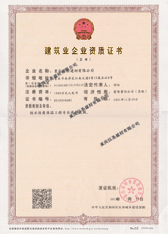 2015年4月,我司啟動了防水防腐保溫工程專業承包資質申報工作,資質申報得到了公司領導及各部門的大力支持與配合。經各方努力,2016年12月05日,我司的資質申請獲重慶市建設委員會專家評審會終審通過并正式核準我司獲得“防水防腐保溫工程專業承包貳級資質”,公司可承擔建筑業的防水、防腐、保溫三方面的工程施工。