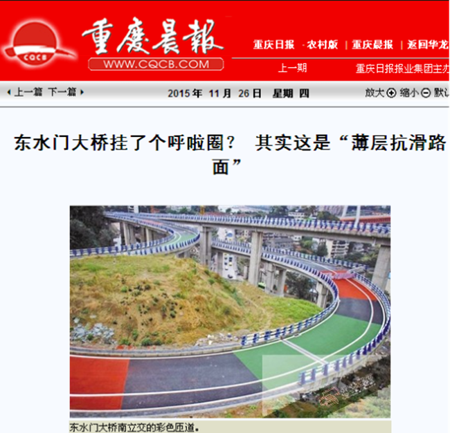 11月26日,重(zhong)慶大渝網(wang)(wang)、重(zhong)慶晨報報道了我司承建的(de)東水門南立交薄層(ceng)環氧抗(kang)滑層(ceng),由于工(gong)程的(de)宏偉(wei)壯觀,且(qie)受到社(she)會的(de)廣泛關(guan)注,新(xin)聞被新(xin)華(hua)網(wang)(wang)、新(xin)浪網(wang)(wang)、人(ren)民(min)網(wang)(wang)、南方網(wang)(wang)、華(hua)龍(long)網(wang)(wang)、軌(gui)道快報等多家主流(liu)媒體轉載報道,點擊率上(shang)萬次。